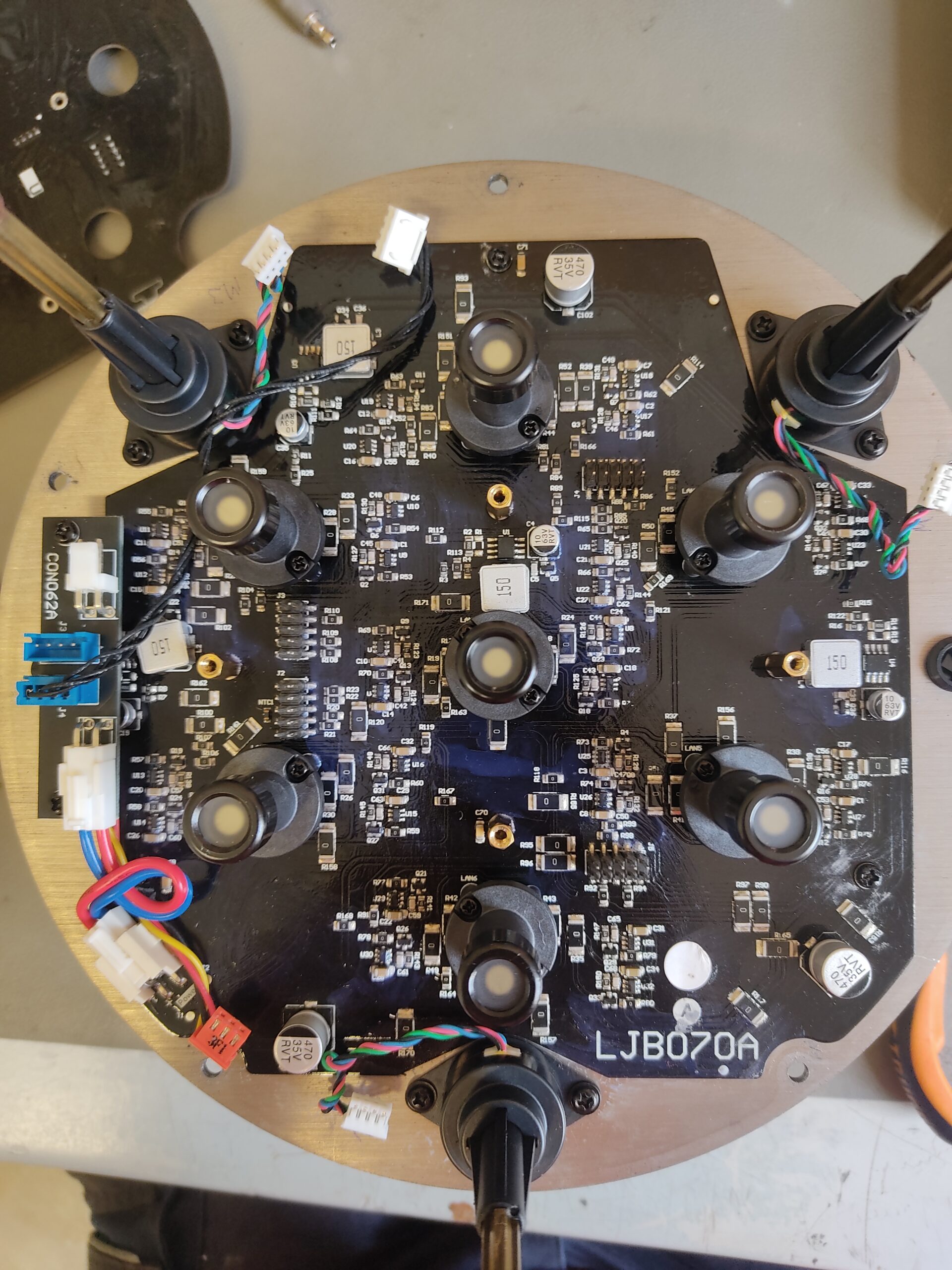 Erster Kandidat zur Reparatur war ein Ultraschallgerät des chinesischen Herstellers CHISON. Die Platine oben im Bild dient der Spannungsversorgung und hat drei unterschiedliche Ausgangsspannungen, davon war eine defekt. Die weitere Fehlersuche führte zur Platine unten im Bild, wo offensichtlich ein Defekt dafür sorgte, dass die o.g. Spannungsversorgung überlastet wurde.