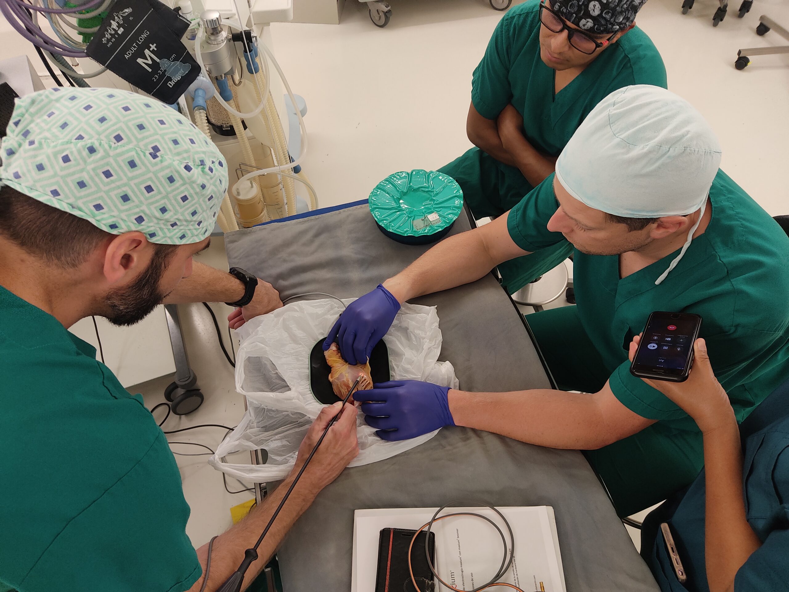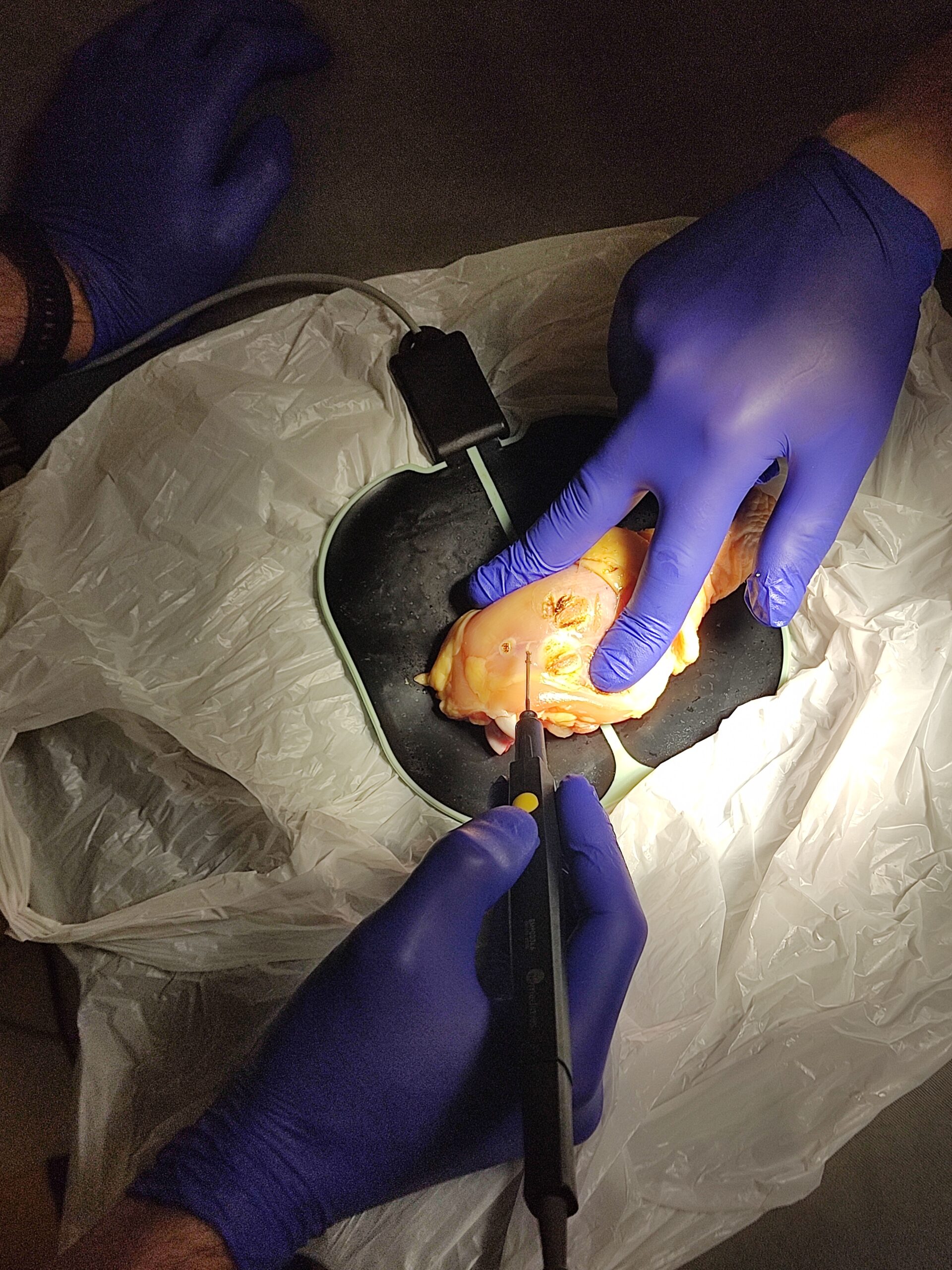 Operación pollo: Elektrochirurgie ist ein weiteres neues Feld für mich. Die Chirurgen Dr. Lukas Steffen und Dr. Hilbert DeVries probierten verschiedene Einstellungen aus, um für ihre Anwendungen die richtige Kombination aus Instrument und Einstellungen für Spannung, Leistung und Frequenz zu ermitteln. In Krankenhäusern in Europa gibt es dafür Assistenten, so dass der Chirurg sich gar nicht mit diesen Details auseinandersetzen muss. Als Versuchsobjekt diente ein Hühnchen (Pollo).